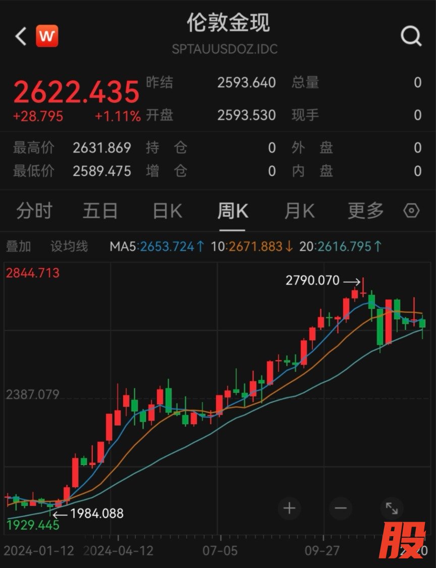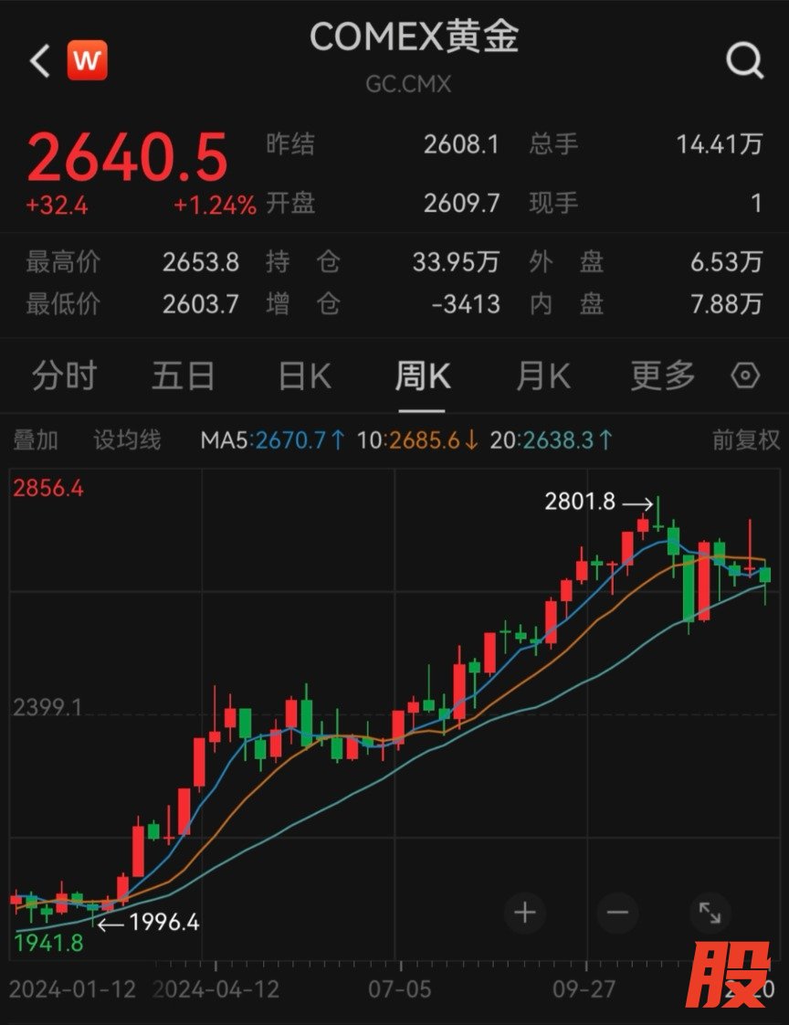 近日,国际金价持续走低,COMEX黄金、伦敦金现于12月18日分别下跌2.34%、2.31%,均创下月内最大日跌幅。截至12月20日,COMEX黄金、伦敦金现分别报2640.5美元/盎司、2622.435美元/盎司,周跌幅分别为1.32%、0.94%。